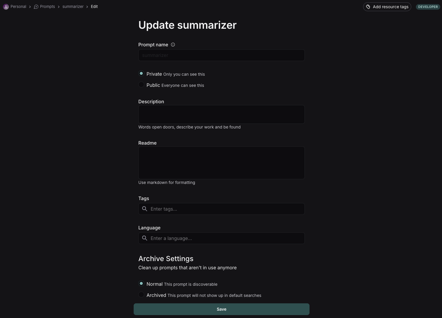 To save your prompt, click the “Save” button, name your prompt, and decide if you want it to be “private” or “public”. Private prompts are only visible to your workspace, while public prompts are discoverable to anyone. The model and configuration you select in the Playground settings will be saved with the prompt. When you reopen the prompt, the model and configuration will automatically load from the saved version.